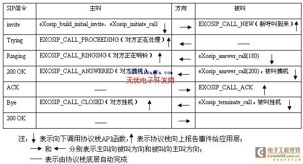 oSIP/eXosip對(duì)消息的報(bào)告有2種工作模式:事件模式和回調(diào)模式。本設(shè)計(jì)采用事件模式, 通過函數(shù)eXosip_event_wait定時(shí)輪詢獲取SIP事件。SIP信令的實(shí)現(xiàn)如表2