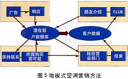 ——銷售支持:東京煤氣公司擁有三種主要的家用產品:地板式空調,煤氣暖氣及煤氣衣服干燥機。此公司于1993年開始運用數據庫營銷,現已取得了驕人的成果。其中主力產品——地板式空調,盡管周期長、價格高,1997年一年就銷售了3萬6千套,同時從對這些用戶調查的結果發(fā)現“滿意”的占96%。下面介紹一下“地板式空調”的營銷方法(見圖5)