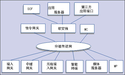 接入層包括各種接入網(wǎng)關(guān)、中繼網(wǎng)關(guān)、無線接入網(wǎng)關(guān)、智能終端以及與處理媒體有關(guān)的媒體服務器和多點處理器(MP)。傳送層包括提供IP包轉(zhuǎn)發(fā)的各種承載網(wǎng)功能實體?刂茖邮荖GN網(wǎng)絡(luò)的核心,主要包括軟交換設(shè)備、信令網(wǎng)關(guān)和多點處理器。業(yè)務層則主要包括應用服務器、第三方應用接口和傳統(tǒng)智能網(wǎng)功能。該業(yè)務層通過開放的業(yè)務層接口向用戶提供傳統(tǒng)智能網(wǎng)業(yè)務、多樣化的第三方業(yè)務和增值業(yè)務。
