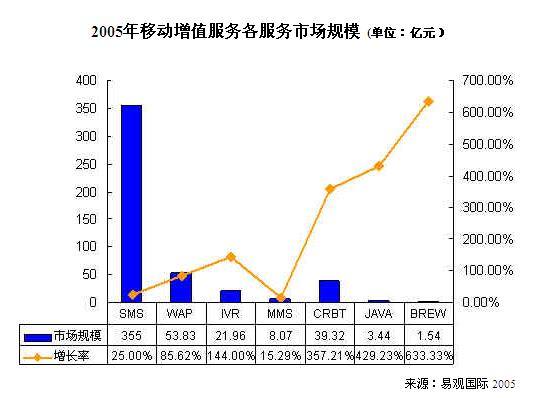 據(jù)易觀國際《中國移動增值服務(wù)市場綜合分析報告2005-2006》報告顯示,2005年在所有的移動增值服務(wù)收入當(dāng)中,2G 服務(wù)占到整體收入比例的86.16%,達到416.28億元。2.5G 服務(wù)僅占到整體收入比例的16.84%,達到66.88億元。其中 CRBT 市場規(guī)模比去年增長了30.72億,同比增長357.21%,其次是 WAP 市場規(guī)模比去年增長了24.83億,同比增長85.62%,成為2005年增長速度和幅度最快的移動增值服務(wù)。