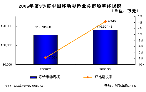 研究表明,2006年第3季度,CRBT業(yè)務(wù)略有反彈。其中移動(dòng)彩鈴業(yè)務(wù)的分帳前信息費(fèi)接近16000萬(wàn)元,較上個(gè)季度小幅度反彈2.6%。但是總體上仍然呈現(xiàn)徘徊態(tài)勢(shì),并沒有走出低級(jí)飽和區(qū)。