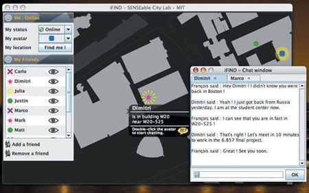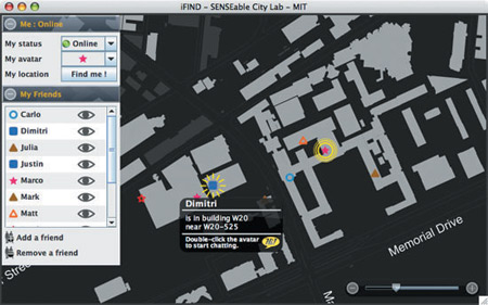 該軟件名為iFind,乍一看類似任何典型的即時通信軟件,也需要雙方相互邀請,這樣才能進(jìn)入對方的好友名單。用戶可以選擇暫時隱藏起來,不讓某個好友或者整個群組看見自己,他們還可以完全把某人從好友名單中刪除。不過iFind的好友名單增加了地圖,可以實時顯示這些朋友在MIT校園的哪個角落。地圖顯示了通過Wi-Fi登錄到MIT網(wǎng)絡(luò)上的好友,讓用戶可以為每個朋友創(chuàng)建獨特的迷你頭像,能看到誰在學(xué)校河邊閑逛、誰在樓上圖書館看書。