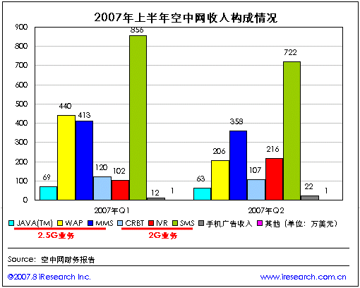 空中網(wǎng)2007年第二季度財(cái)報(bào)數(shù)據(jù)顯示,第二季度空中網(wǎng)的總收入1695.9萬美元,同比負(fù)增長(zhǎng)43.6%,環(huán)比負(fù)增長(zhǎng)15.7%。與第一季度相比在空中網(wǎng)兩個(gè)產(chǎn)品平臺(tái)的主要2G業(yè)務(wù)和2.5G的業(yè)務(wù)收入都出現(xiàn)了不同程度的下降,但2G業(yè)務(wù)中的IVR業(yè)務(wù)收入則出現(xiàn)了大幅上升。