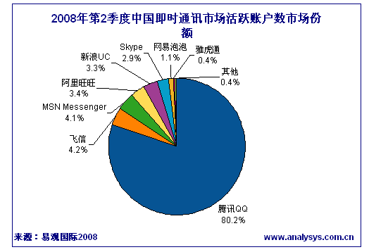 2008年第2季度中國(guó)即時(shí)通訊活躍帳戶數(shù)達(dá)4.26億 飛信躍居第二位