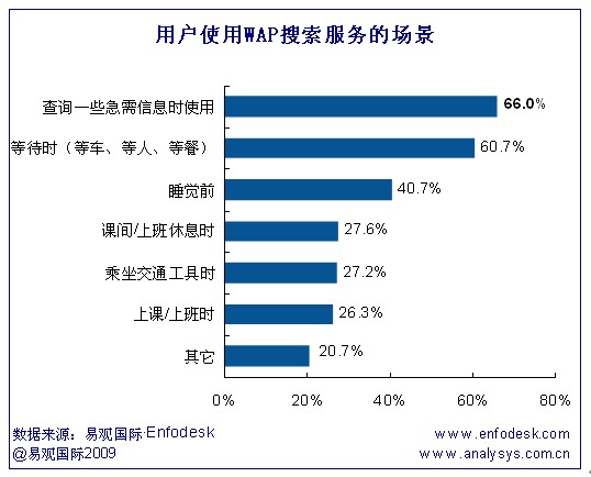 根據(jù)易觀Enfodesk《中國移動搜索市場用戶調(diào)研報告2009》研究發(fā)現(xiàn),用戶使用WAP搜索服務(wù),一般情況是在查詢一些急需信息和等待時(等車、等人、等餐),這兩類情形的使用比例均在60%以上。值得注意的是,在睡覺前,用戶使用移動搜索服務(wù)的比例達(dá)40.7%。而在其他休閑時間,如課間/上班休息時、乘坐交通工具、上課/上班時也是用戶經(jīng)常使用WAP搜索服務(wù)的場景。