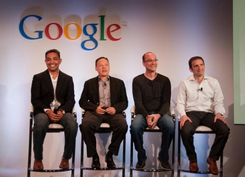 圖:參加發(fā)布會(huì)的嘉賓從左至右分別為摩托羅拉CEO桑杰·賈、宏達(dá)電CEO周永明、谷歌Android主管魯賓和谷歌產(chǎn)品發(fā)展副總裁奎羅斯