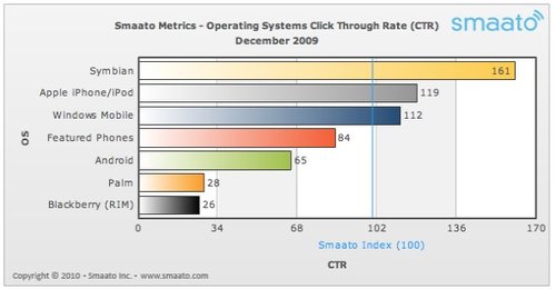 Smaato的數(shù)據(jù)顯示,將所有手機平臺的移動廣告平均點擊率設(shè)為100分,那么Symbian的得分高達161分,排名第一,遙遙領(lǐng)先于得分119、排名第二的iPhone,而Android得分僅65。比Android更差的是Palm和黑莓手機。