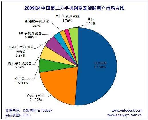 易觀國(guó)際(Analysys International)分析認(rèn)為,2009年4季度中國(guó)手機(jī)瀏覽器市場(chǎng)隨著騰訊、3G門戶等實(shí)力強(qiáng)勁的廠商發(fā)力,搶占用戶的市場(chǎng)競(jìng)爭(zhēng)變得日漸激烈。處于不同手機(jī)瀏覽器陣營(yíng)的廠商都紛紛通過(guò)技術(shù)改進(jìn)與大力度的市場(chǎng)營(yíng)銷廣泛推廣自有產(chǎn)品。