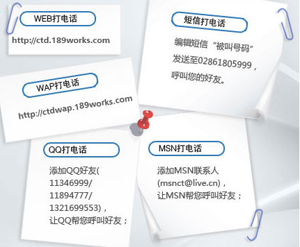 據(jù)“通話寶”官方網(wǎng)站(http://ctd.189works.com/)介紹,“通話寶”目前支持WEB、WAP、短信及QQ和MSN五種撥打網(wǎng)絡(luò)電話的方式。用戶(hù)除了使用WEB、WAP訪問(wèn)網(wǎng)頁(yè)撥打電話外,還可以通過(guò)添加特定的QQ號(hào)碼或者M(jìn)SN聯(lián)系人實(shí)現(xiàn)帳號(hào)注冊(cè)、撥打電話等操作。