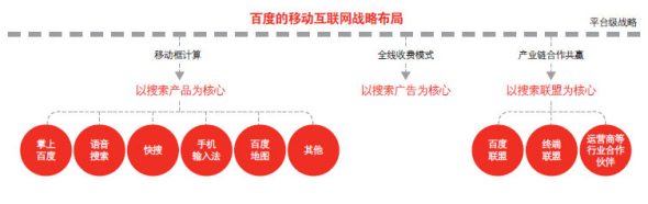 百度無線的戰(zhàn)略仍將以搜索作為核心!鞍俣仍跓o線方面的核心發(fā)展規(guī)劃就三條:第一條,以搜索產(chǎn)品為核心布局移動(dòng)框計(jì)算。第二條,以搜索廣告位核心,探索全線收費(fèi)模式。第三條,以搜索聯(lián)盟為核心,推動(dòng)產(chǎn)業(yè)鏈合作共贏。”這是百度的官方說法。