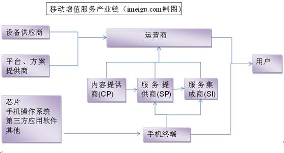 在移動(dòng)增值服務(wù)產(chǎn)業(yè)鏈當(dāng)中,運(yùn)營(yíng)商仍然處于核心地位。因?yàn)樗莆沼脩糍Y源和收費(fèi)渠道、具有網(wǎng)絡(luò)資源優(yōu)勢(shì),所以在移動(dòng)增值業(yè)務(wù)收入上 ,它可以完全獲得網(wǎng)絡(luò)流量費(fèi)、獲得消息類業(yè)務(wù)的絕大部分,并且獲得內(nèi)容和服務(wù)的收入分成,部分市場(chǎng)這一分成比例高達(dá)50%。內(nèi)容提供商(CP)、服務(wù)提供商(SP)、服務(wù)集成商(SI)統(tǒng)稱為增值服務(wù)提供商。中國(guó)的移動(dòng)增值業(yè)務(wù)提供商,規(guī)模一般較小,依附于網(wǎng)絡(luò)運(yùn)營(yíng)商,依靠分成生存,受總體經(jīng)濟(jì)形勢(shì)和市場(chǎng)本身發(fā)展影響大,2008年增值電信業(yè)務(wù)經(jīng)營(yíng)者數(shù)量首次出現(xiàn)負(fù)增長(zhǎng),經(jīng)營(yíng)者數(shù)量同比減少5%,目前數(shù)量近2萬(wàn)家。