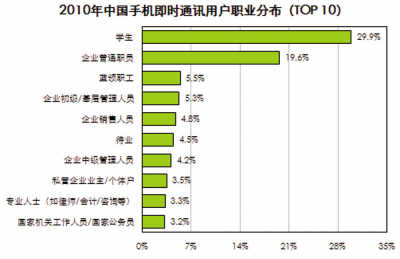 一系列研究數(shù)據(jù)足以說明些問題。研究公司艾瑞咨詢報告數(shù)據(jù)顯示,2010年中國手機上網(wǎng)用戶達到3.03億,在總網(wǎng)民數(shù)中占比約為66.3%。這其中,57.4%的用戶使用即時通訊服務,位列手機上網(wǎng)用戶十大行為的第二位。