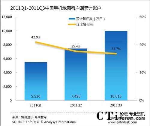 2011年第3季度中國(guó)手機(jī)地圖客戶(hù)端累計(jì)帳戶(hù)過(guò)億