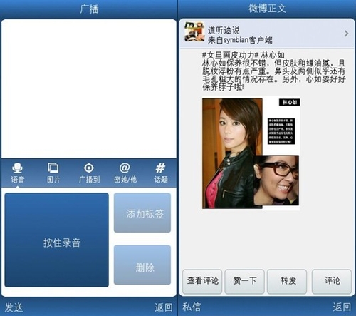 語音微博1.6 for Symbian新加入的私信和經(jīng)驗(yàn)系統(tǒng)的加入使得用戶間信息的交流更緊密、分享更便捷。從此,千里傳音不是夢。