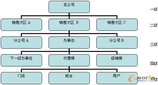目前國(guó)內(nèi)企業(yè)分銷網(wǎng)絡(luò)層次最多可達(dá)到五層,如圖1所示。最上層是營(yíng)銷總部,第二層是銷售大區(qū),第三層是各地分公司、辦事處,第四層是各地辦事處、代理商和經(jīng)銷商,第五層是用戶或門店。
