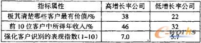 對(duì)《財(cái)富》雜志排名前l(fā)000位公司的200位經(jīng)理調(diào)查后得出結(jié)論,企業(yè)增長(zhǎng)性與清楚的識(shí)別客戶有明顯的聯(lián)系(見表1)。該表反映了高增長(zhǎng)率的企業(yè)比低增長(zhǎng)率的企業(yè)更加懂得客戶識(shí)別的重要性,并運(yùn)用技巧來(lái)強(qiáng)化核心客戶為企業(yè)創(chuàng)造更多價(jià)值。