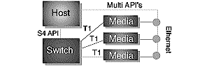 使用TAPI、S.100和H.100規(guī)格,服務(wù)點(diǎn)的主機(jī)、交換和媒體資源能有效的集成到一個(gè)交換平臺(tái)中(見圖三)早期的集成結(jié)構(gòu)受非冗余備份交換的限制,不能滿足服務(wù)供應(yīng)商的需求。S.100和TAPI也不能滿足諸如處理器冗余備份和資源分布的要求,應(yīng)用于PC平臺(tái)的H.100標(biāo)準(zhǔn)也不支持“無信號(hào)點(diǎn)的故障“(no signal point of failure)的載體需求。而Sigma計(jì)劃的支持全標(biāo)準(zhǔn)兼容性克服了這些限制。
