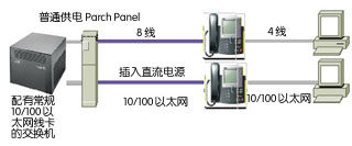 第二種方式是,在局域網交換機和電話機之間增加一個專用供電設備,一邊是多路普通網絡線從局域網交換機接入,另一邊則是增加了供電的多路網絡線,接出到IP電話機。這種設備一般安置在機房,只是增加了機房內的網線排列。如下圖: