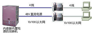 第三種方式,是擴充局域網交換機的功能,在局域網交換機的接口模塊上增加特殊部件,實現(xiàn)內置供電功能(Inline Power)。如下圖: