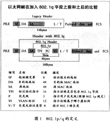 這種解決方案是根據(jù)對(duì)IEEE 802.1p/q協(xié)議字段的處理來區(qū)分不同優(yōu)先級(jí)業(yè)務(wù)的。IEEE 802.1p/q同屬于一個(gè)子集,它在傳統(tǒng)的以太網(wǎng)幀頭中加入了4個(gè)字節(jié),其中802.1p占3位。802.1p延伸了802.1d的協(xié)議,利用3位優(yōu)先級(jí)位可以最多提供8個(gè)優(yōu)先等級(jí)。而802.1q利用VI(VLAN Identifier,虛擬網(wǎng)標(biāo)識(shí))位識(shí)別傳送的幀究竟屬于哪一個(gè)虛網(wǎng)。VI位共有12位,最大可以支持的虛網(wǎng)個(gè)數(shù)不會(huì)超過4096個(gè)。 802.1p/q的具體定義可以參見圖1。