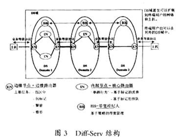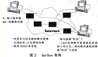 在廣域網(wǎng)上,IETF(Internet Engineering Task Force)定義了兩種IP QoS結(jié)構(gòu)——綜合業(yè)務(wù)結(jié)構(gòu)(Int-Serv )和業(yè)務(wù)區(qū)分結(jié)構(gòu)(Diff-Serv)。兩種結(jié)構(gòu)各有其特點(diǎn)和優(yōu)勢,目前還無法互通。