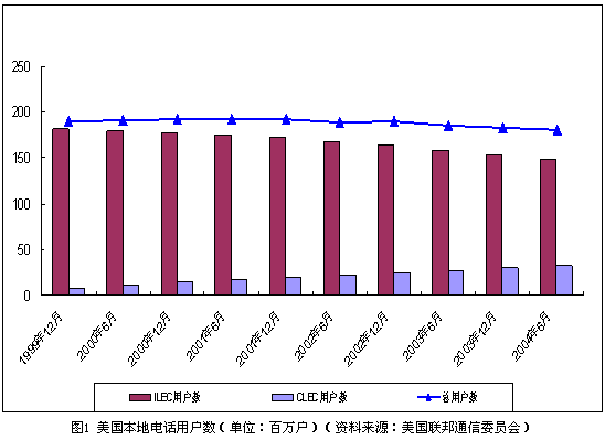 就整體而言,美國本地電話用戶總量穩(wěn)中有降,移動(dòng)通信的替代作用開始顯現(xiàn)。截止到2004年6月,包括住宅和商業(yè)用戶,美國本地電話用戶總量達(dá)到1.81億戶。但與3年前相比,美國本地電話用戶數(shù)量實(shí)際減少了近1200萬戶。與此同時(shí),移動(dòng)用戶數(shù)量迅速增長(zhǎng)。截止到2004年6月,美國移動(dòng)電話用戶數(shù)比上年同期增長(zhǎng)13%,達(dá)到1.673億戶,基本接近固定電話用戶的數(shù)量。