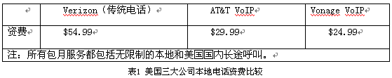 隨著寬帶接入的進(jìn)一步普及,VoIP似乎為打破本地環(huán)路的瓶頸提供了新的選擇,AT&T、Qwest、時(shí)代華納、Verizon等老牌運(yùn)營(yíng)商紛紛開始提供這項(xiàng)服務(wù)。AT&T于2004年3月在新澤西州和德克薩斯州推出了29.99美元的包月計(jì)劃,其VoIP業(yè)務(wù)不僅包含了基本語音服務(wù),也提供諸如呼叫轉(zhuǎn)移、會(huì)議電話、來電顯示等增值服務(wù),美國三大公司本地電話資費(fèi)如表1所示。