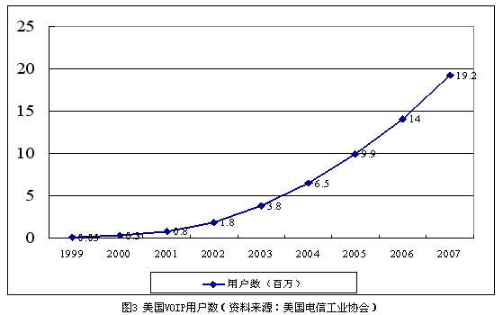 與此同時(shí),Qwest也開始在明尼蘇達(dá)州提供類似的VoIP業(yè)務(wù),并計(jì)劃在近期內(nèi)推向全國。Verizon與北電網(wǎng)絡(luò)簽訂了大筆的訂單,計(jì)劃全面改造其本地電話網(wǎng)絡(luò)提供的VoIP業(yè)務(wù)。一些曾經(jīng)著名的網(wǎng)絡(luò)電話公司(如Net2Phone)也開始進(jìn)入傳統(tǒng)電話市場(chǎng)。截止到2004年2月底,Vonage的全I(xiàn)P網(wǎng)絡(luò)已經(jīng)擁有13萬VoIP用戶。據(jù)美國電信工業(yè)協(xié)會(huì)預(yù)測(cè),到2007年年末,全美的VoIP用戶將會(huì)達(dá)到1920萬戶,如圖3所示。