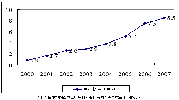 隨著有線電視用戶數(shù)量逐漸達(dá)到飽和,有線電視公司也在積極尋找新的利潤(rùn)增長(zhǎng)點(diǎn)。在過去的7年中,有線電視公司投入了高達(dá)800億美元的資金用于網(wǎng)絡(luò)升級(jí)改造,現(xiàn)在,大部分有線電視網(wǎng)絡(luò)已經(jīng)可以提供包括寬帶接入、本地和長(zhǎng)途電話、數(shù)字電視、視頻點(diǎn)播等在內(nèi)的一攬子服務(wù)。到2004年末,有線電視公司已經(jīng)擁有超過380萬的本地電話用戶。根據(jù)美國電信工業(yè)協(xié)會(huì)的估算,到2007年,全美將會(huì)有超過800萬的用戶選擇基于有線電視網(wǎng)的基本電信業(yè)務(wù),如圖4所示。