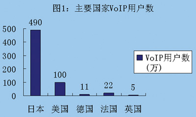 目前全球VoIP市場已經(jīng)形成,明顯的市場劃分也已出現(xiàn)。截至2004年底,日本共擁有VoIP用戶490萬,美國100萬,德國11萬,法國22萬,英國5萬 (如圖1所示)。根據(jù)Insight Research的調(diào)查,全球VoIP市場收入將在2005年達(dá)到820億美元,在2007年達(dá)到1965億美元,其中大部分增長是由商業(yè)用戶驅(qū)動(dòng)的。
