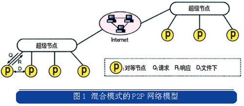 Skype是P2P技術(shù)演進(jìn)到混合模式后的典型應(yīng)用,它結(jié)合了集中式和分布式的特點(diǎn),在網(wǎng)絡(luò)的邊緣節(jié)點(diǎn)采用集中式的網(wǎng)絡(luò)結(jié)構(gòu),而在超級(jí)節(jié)點(diǎn)之間采用分布式的網(wǎng)絡(luò)結(jié)構(gòu),混合模式的P2P網(wǎng)絡(luò)模型如圖1所示。
