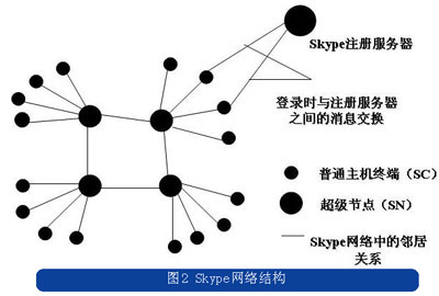 與常規(guī)的電信業(yè)務(wù)網(wǎng)絡(luò)不同的是,Skype的網(wǎng)絡(luò)中除了注冊(cè)服務(wù)器,沒有其他任何集中的服務(wù)器,只是將用戶節(jié)點(diǎn)分為普通節(jié)點(diǎn)和超級(jí)節(jié)點(diǎn)。Skype的系統(tǒng)連接結(jié)構(gòu)如圖2所示。