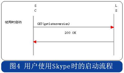Skype的用戶終端啟動(dòng)時(shí),采用HTTP協(xié)議連接到注冊(cè)服務(wù)器,用戶初次安裝的啟動(dòng)流程中攜帶“installed”的參數(shù),使用時(shí)啟動(dòng)流程則在消息中攜帶“getlatestversion”參數(shù),具體流程分別見圖3和圖4。
