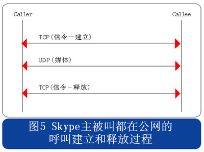 從上述流程圖可見,Skype的呼叫信令都采用TCP封裝,而媒體流則使用UDP封裝,當(dāng)有任何一方用戶位于限制UDP包的防火墻內(nèi)時(shí),媒體流就會(huì)采用TCP封裝。另外當(dāng)Skype用戶至少有一方位于私網(wǎng)內(nèi)時(shí),所有的信令和媒體消息都經(jīng)過一個(gè)或多個(gè)中間節(jié)點(diǎn)轉(zhuǎn)發(fā)。此時(shí)無需擔(dān)心用戶通話的媒體流因?yàn)榻?jīng)過中間節(jié)點(diǎn)轉(zhuǎn)發(fā)而被竊聽,因?yàn)镾kype采用了對(duì)消息進(jìn)行端到端加密的機(jī)制。