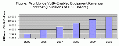 2006年11月?lián)y(tǒng)計(jì),全球VoIP設(shè)備銷(xiāo)售收入將從2005年的39.5億美元增長(zhǎng)到2010年的119億美元,年度復(fù)合增長(zhǎng)率為24.7%。如下圖所示。VoIP市場(chǎng)主要包括三個(gè)用戶(hù)群:用于企業(yè)的專(zhuān)用電話(huà)交換機(jī)(PBX),服務(wù)供應(yīng)商的基礎(chǔ)架構(gòu)以及住宅接入設(shè)備。