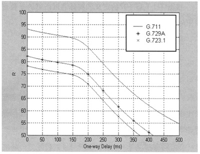 。1)延時(delay),指IP包從網(wǎng)絡入口點到達網(wǎng)絡出口點所需要的傳輸時間。如果在一個呼叫中包含不同的通路時間,則存在抖動,抖動越大則語音質(zhì)量下降的越明顯。在E模型中采用固定緩沖區(qū)的方法,可以使抖動的影響轉(zhuǎn)化為延時[7]。