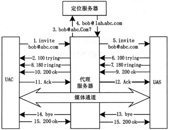 URI地址,建議利用DNS系統(tǒng),解析該地址得到該域中SIP代理服務器地址,信令到達該服務器后,再查詢該域中的位置登記服務器,即可定位到被叫用戶當前所在地址。