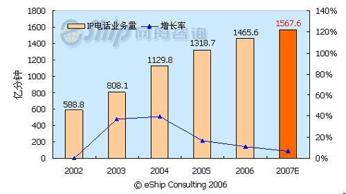 從圖中可以看出,國內(nèi)IP電話市場(chǎng)近年呈現(xiàn)出快速增長趨勢(shì),2002-2007年年均增長率為20.7%。預(yù)計(jì)2007年IP電話的通話時(shí)長將達(dá)到1567.6億分鐘,同比增長7%。但從2005年開始,IP電話的增長率呈下降趨勢(shì),這主要是受管制限制和移動(dòng)長途的替代作用所致。