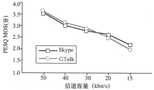 MOS(見圖3),發(fā)現(xiàn)在信道容量為50 kbit/s時(shí)GTalk利用了更多的帶寬,傳輸速率比Skype更高。當(dāng)信道容量變?yōu)?0