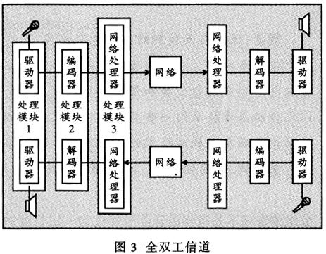 ——傳輸是依靠每一端三級(jí)的同步有效操作。如圖3所示,在像IP電話這樣的全雙工通信中,每一端的六級(jí)都是連續(xù)工作的。因此在具體應(yīng)用時(shí)為了減少分離處理的數(shù)量,這六級(jí)被合成同時(shí)工作的三個(gè)處理過程。