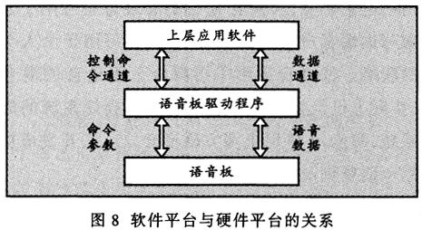 ——為便于在Windows95環(huán)境下使用該平臺(tái),開發(fā)了虛擬設(shè)備驅(qū)動(dòng)程序。該程序?yàn)樯蠈榆浖峁┝素S富的接口函數(shù),用于實(shí)現(xiàn)對(duì)語音板的操作。軟件平臺(tái)與硬件平臺(tái)的關(guān)系如圖8所示。
