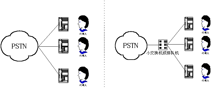 呼叫中心,早期是指一個(gè)由兩人或更多人組成的、在一個(gè)特定地方用專用設(shè)備處理電話業(yè)務(wù)的小組。這些人就是通常所說的呼叫中心代理(人)。一個(gè)呼叫中心可以只提供信息接收服務(wù),或者只提供信息發(fā)送服務(wù),或者是一個(gè)混合式呼叫中心,其呼叫中心代理會(huì)負(fù)責(zé)所有這兩項(xiàng)工作。從物理設(shè)備構(gòu)成來(lái)看,第一代呼叫中心可用下圖(1)、(2)表示。