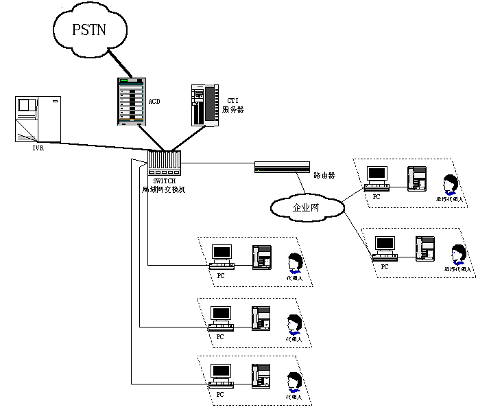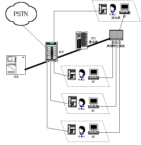 隨著計(jì)算機(jī)技術(shù)和通信技術(shù)的發(fā)展,第一代呼叫中心由于基本靠人工操作,對(duì)話務(wù)員的要求相當(dāng)高,而且勞動(dòng)強(qiáng)度大、功能差,已明顯不適應(yīng)時(shí)代發(fā)展的需要。因此,功能完善的第二代呼叫中心系統(tǒng)隨即應(yīng)運(yùn)而生。如圖(3)所示。第二代呼叫中心特點(diǎn):廣泛采用了計(jì)算機(jī)技術(shù),如通過局域網(wǎng)技術(shù)實(shí)現(xiàn)數(shù)據(jù)庫(kù)數(shù)據(jù)共享;語(yǔ)音自動(dòng)應(yīng)答技術(shù)用于減輕話務(wù)員的勞動(dòng)強(qiáng)度,減少出錯(cuò)率;采用自動(dòng)呼叫分配器均衡座席話務(wù)量、降低呼損,提高客戶的滿意度等等。但第二代呼叫中心也存在一定的缺點(diǎn):它需要采用專用的硬件平臺(tái)與應(yīng)用軟件,還需要投入大量資金用于集成和客戶個(gè)性化需求,靈活性差、升級(jí)不方便、風(fēng)險(xiǎn)較大、造價(jià)也較高!
