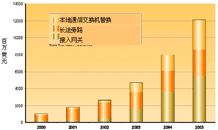 隨著因特網(wǎng)業(yè)務(wù)的普及,與傳統(tǒng)電信業(yè)務(wù)供應(yīng)商形成競(jìng)爭(zhēng)、替代局面的新業(yè)務(wù)供應(yīng)商看到了重大的機(jī)會(huì):利用通過(guò)包網(wǎng)絡(luò)傳送話音(VoP)業(yè)務(wù)取代分離的話音/數(shù)據(jù)網(wǎng)業(yè)務(wù)。VoP技術(shù)最初主要用于長(zhǎng)途旁路。在過(guò)去的兩年里,VoP網(wǎng)絡(luò)的發(fā)展勢(shì)頭明顯加快,通過(guò)寬帶網(wǎng)傳送話音的接入網(wǎng)關(guān)正在推廣,利用VoP本地網(wǎng)關(guān)代替?zhèn)鹘y(tǒng)中心局交換機(jī)的機(jī)會(huì)也已出現(xiàn)。圖1用圖例說(shuō)明了VoP在交換機(jī)替換、長(zhǎng)途旁路和接入網(wǎng)關(guān)方面市場(chǎng)的分塊大小以及對(duì)末來(lái)的預(yù)測(cè)。