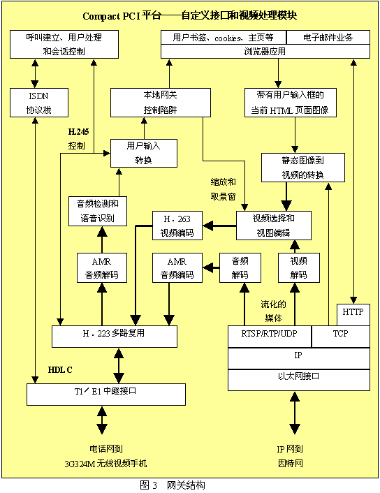 圖3所示為網(wǎng)關(guān)重要組成的分解圖。網(wǎng)關(guān)機(jī)箱很可能是一個(gè)Compact PCI機(jī)箱,機(jī)箱中包含了作為網(wǎng)絡(luò)中一個(gè)節(jié)點(diǎn)的所有組件。基本的視頻呼叫和瀏覽器應(yīng)用可以運(yùn)行在主處理器上,但T1或E1接口需要由附加模塊來(lái)支持。為了支持大量的端口,還需要附加的以太網(wǎng)接口和自定義的視頻處理模塊。T1/E1接口通過(guò)公共電話網(wǎng)接入無(wú)線交換中心,也可以直接接入到無(wú)線交換中心。以太網(wǎng)接口會(huì)通過(guò)標(biāo)準(zhǔn)IP路由器接入到因特網(wǎng)。