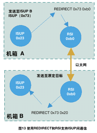 例如,一個雙ISUP系統(tǒng)應(yīng)該由兩個ISUP部分組成,每部分缺省module_id都為0x23。A方ISUP的配置數(shù)據(jù)表示另一個ISUP部分的module_id為0x73;因此,在A方將會有一個重定向的動作來對經(jīng)過RSI發(fā)送往0x73的任何訊息重新定向。在B方,應(yīng)該有一個REDIRECT語句將B方RSI所接收的所有目標為0x73的訊息路由到本地ISUP,標識為0x23。具體情況如圖13所示。