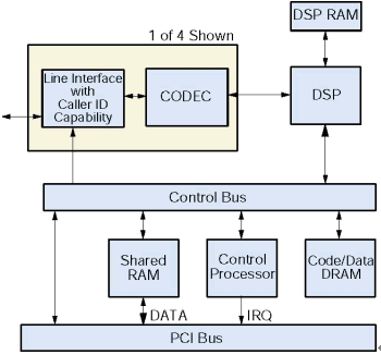 一個(gè)板卡上的微處理器控制D/4PCIU和D/4PCIUF通過(guò)一個(gè)本地總線控制板卡所有操作,它從主機(jī)截獲和執(zhí)行命令。這個(gè)微處理器處理實(shí)時(shí)的事件,管理和主機(jī)交互的數(shù)據(jù)流,提高系統(tǒng)的反應(yīng)時(shí)間,減少主機(jī)處理的需求,傳遞給應(yīng)用程序之前處理DTMF和電話信令,把DSP解脫出來(lái)專門(mén)做信令處理。這個(gè)微處理器和主機(jī)的通信是通過(guò)一個(gè)共享RAM,它作為一個(gè)輸入/輸出緩沖區(qū)增加的磁盤(pán)文件傳輸?shù)男。這個(gè)RAM和主機(jī)的接口是PCI總線。為了滿足實(shí)時(shí)系統(tǒng)的要求,所有操作的是中斷驅(qū)動(dòng)的。所有安裝在PC里面的D/4PCIUF板卡共享同一個(gè)中斷。在系統(tǒng)初始化的時(shí)候,固件從主機(jī)下載到板卡上的代碼/數(shù)據(jù)