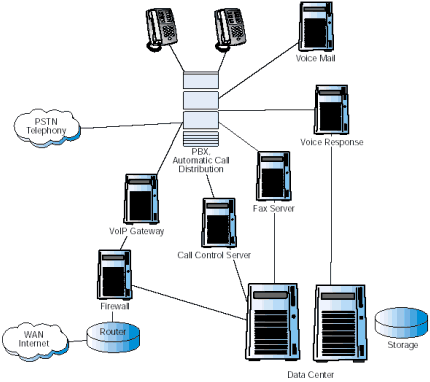 傳統(tǒng)的企業(yè)通信系統(tǒng)通常如下建立:以一個(gè)PBX或KTS為核心,加上附屬的媒體服務(wù)器。其中媒體服務(wù)器支持各種應(yīng)用,比如說(shuō)語(yǔ)音郵件和交互式語(yǔ)音應(yīng)答(IVR,interactive