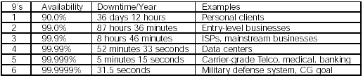 正如表中建議的那樣,實(shí)用性尤其在非常接近1的區(qū)間內(nèi)才被討論。盡管99%的正常運(yùn)行時(shí)間看起來很好,它仍然將導(dǎo)致每年超過3天半的故障時(shí)間。大部分方案不會(huì)被認(rèn)為是高可用的,直到它們接近99.9%的運(yùn)行時(shí)間--大概每年9個(gè)小時(shí)的故障時(shí)間。但是,通信行業(yè)使用4個(gè)9級(jí)別到5個(gè)9級(jí)別范圍的實(shí)用性。