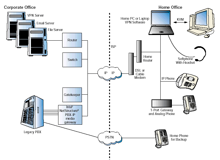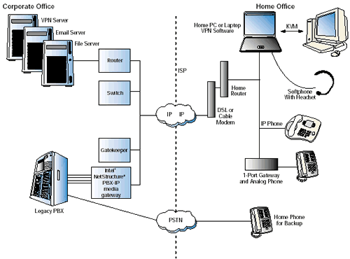 為了實現(xiàn)這個VoIP解決方案,PBX-IP網(wǎng)關(guān)連接到了辦公室里的原有的PBX和關(guān)鍵系統(tǒng)上,還有網(wǎng)守軟件實現(xiàn)一些呼叫的路由以及地址轉(zhuǎn)換。然后遠程辦公者連接到了網(wǎng)關(guān)上--最終連接到公司PBX上--或者使用IP軟電話,或者一個實際的IP電話,或者一個單端家庭網(wǎng)關(guān)連接到模擬耳機上。